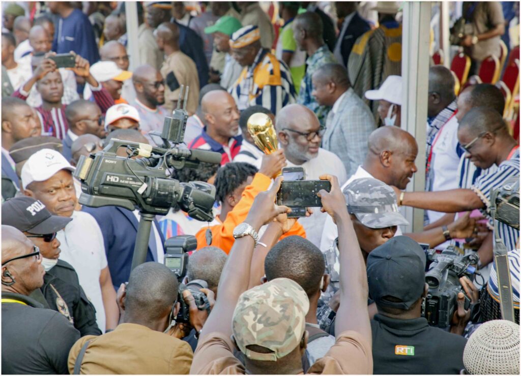 C’est dans une ambiance empreinte de fierté nationale que Bleu Charlemagne, président de la Fédération Internationale de Maracana et Disciplines Associées (FIMADA) et président de la commission jeux et sports patrimoniaux du festival, a présenté ce trophée historique. Originaire de Louanville, dans la sous-préfecture de Gbangbegouiné, Bleu Charlemagne a déclaré avec émotion « Cette victoire au mondial de maracana témoigne de l’unité, du talent et de l’engagement de nos sportifs. Ce trophée est un hommage au travail acharné de notre équipe, mais aussi à la passion de tout un peuple pour cette discipline. » La cérémonie, qui s’est tenue en présence de personnalités de premier plan telles que le ministre-gouverneur Albert Flindé, le général Vagondo Diomandé, ministre de l’Intérieur, et le ministre-conseiller Mabri Toikeusse, Président du Conseil d’Administration du festival, a souligné l’importance du sport comme vecteur de rassemblement et de rayonnement international.