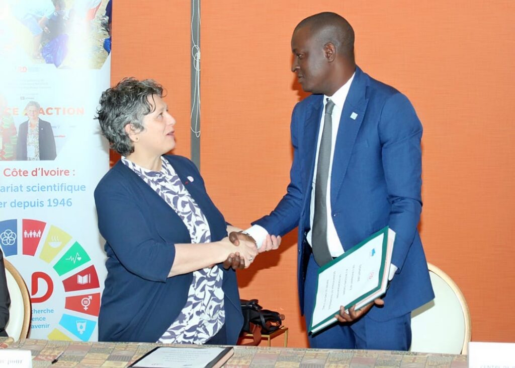Temps fort de la cérémonie, le Centre de Recherches Océanologiques, conduit par son Directeur, le professeur Bafétigué Ouattara, a procédé à la signature de l’avenant n°2 de sa convention-cadre de partenariat avec l’IRD. L’accord a été paraphé avec la Présidente-Directrice générale de l’IRD, la professeure Valérie Verdier, renforçant ainsi une coopération scientifique de longue date axée sur la recherche, la formation et l’innovation.